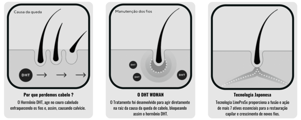 O DHT WOMAN é uma formulação importada Japonesa que contém tudo o que você precisa para restaurar a sua saúde capilar e voltar a crescer cabelos em regiões falhas da cabeça. Ele age bloqueando o hormônio responsável por causar a queda de fios e o adoecimento do couro cabeludo.